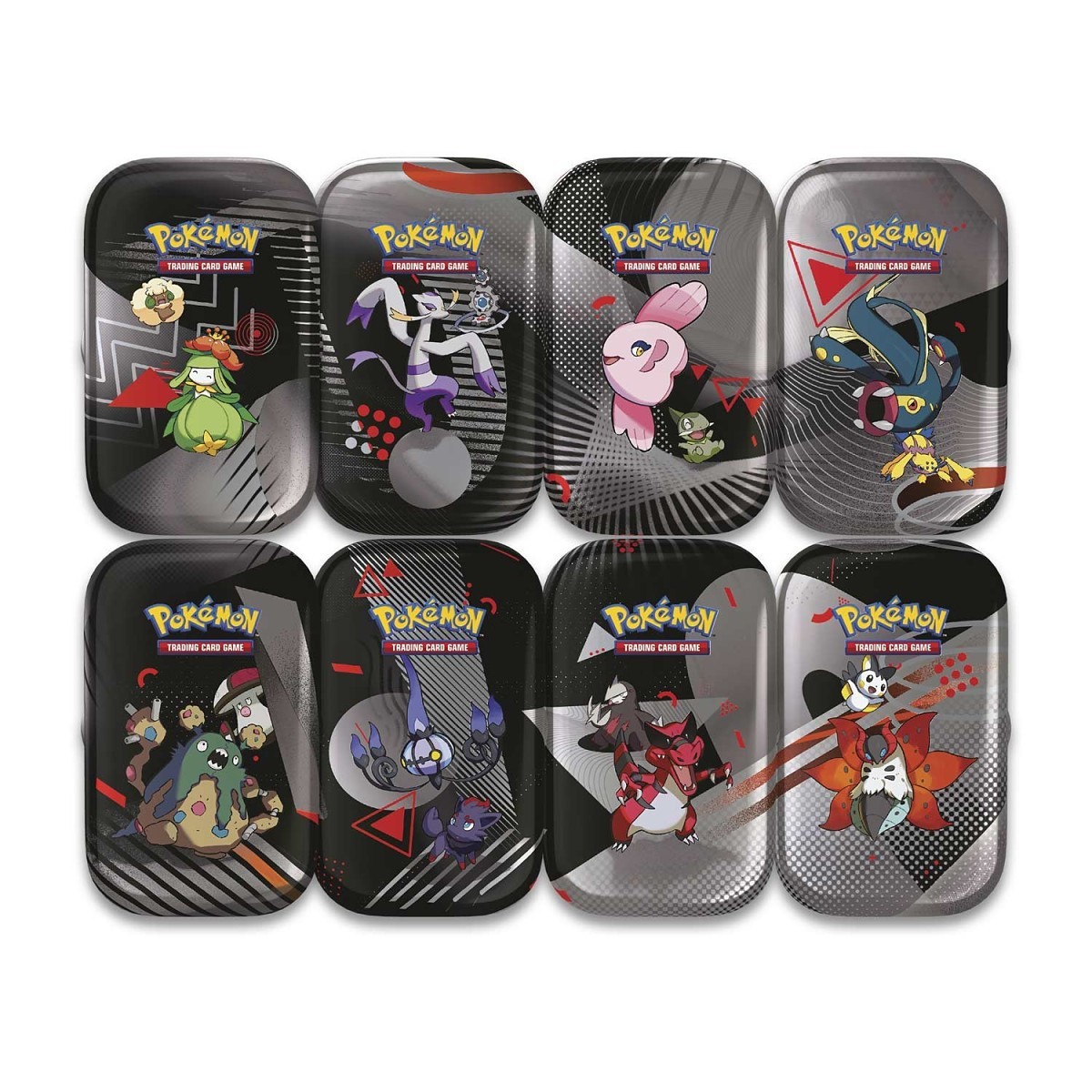 - Each Mini Tin includes a Pokémon TCG: Scarlet & Violet—Black Bolt booster pack, a Pokémon TCG: Scarlet & Violet—White Flare booster pack, a sticker card showing the art from the Mini Tin, and a Pokémon art card showing the art from the Mini Tin